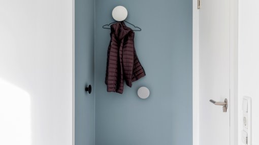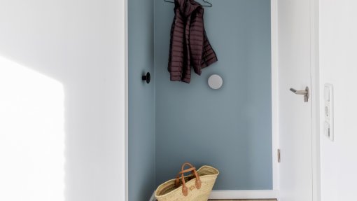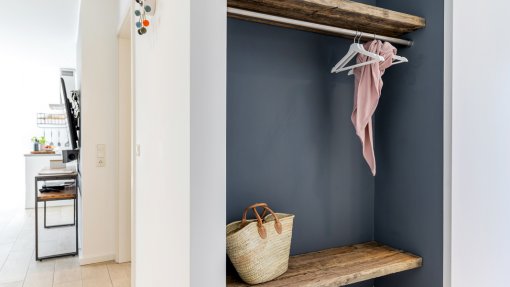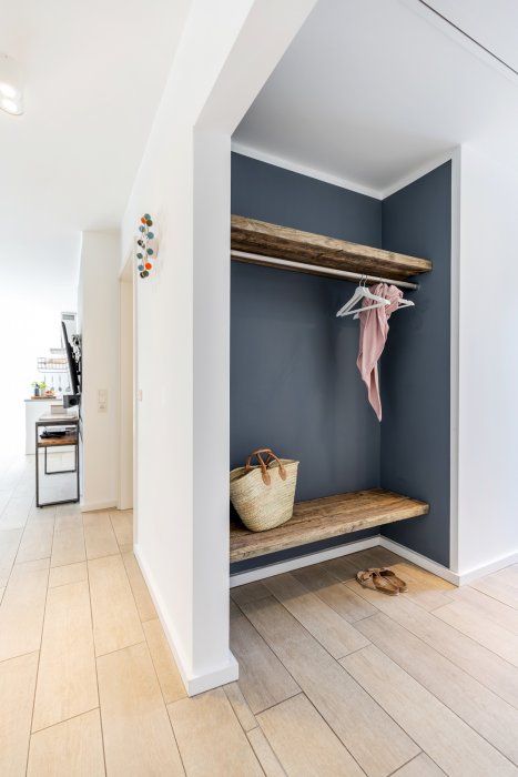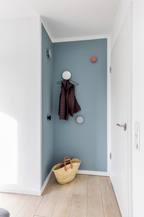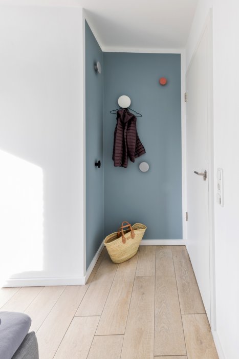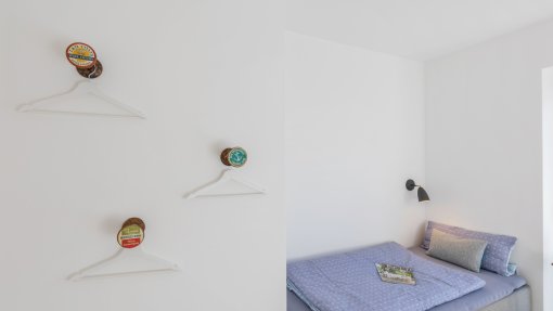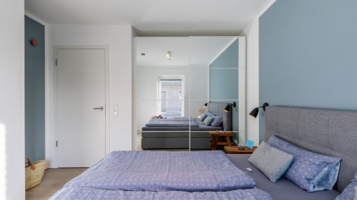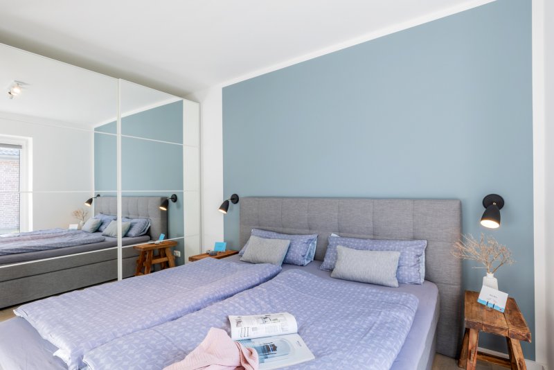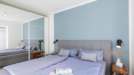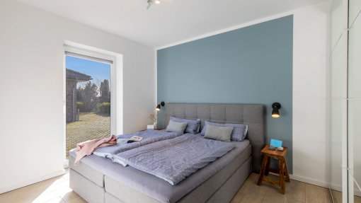 Boxspring-Doppelbett (180x200 cm) Bettwäsche inklusive, großer Einbau-Kleiderschrank, Garderobe mit "Muuto - The Dots" Wandhaken, Fußbodenheizung, Fliegengitter