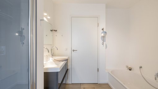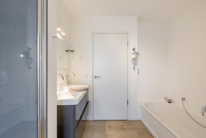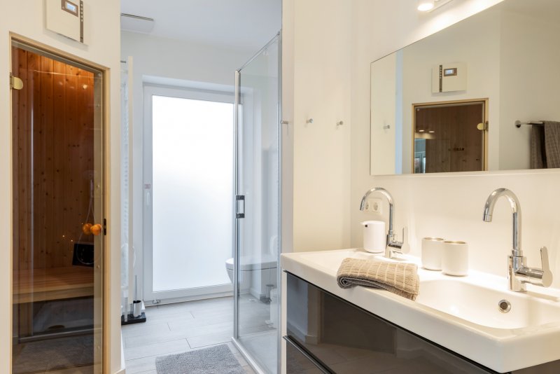 Sauna, Föhn, Villeroy & Boch Tiefspül-WC, Rainshower-Dusche mit Handbrause (bodengleich), 1,90m Badewanne mit Mittelablauf, Spiegel, Doppelwaschbecken mit Unterschrank, Kosmetikspiegel, Fußbodenheizung, Fenster, Fliegengitter