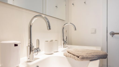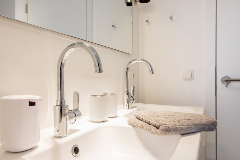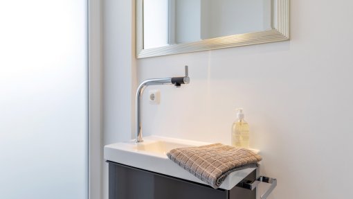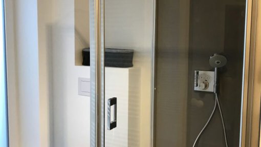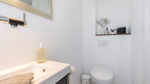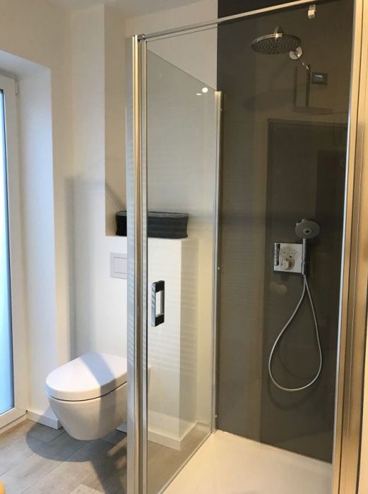 Villeroy & Boch Tiefspül-WC, Waschbecken mit Unterschrank, Spiegel, Fußbodenheizung, Fenster, Fliegengitter